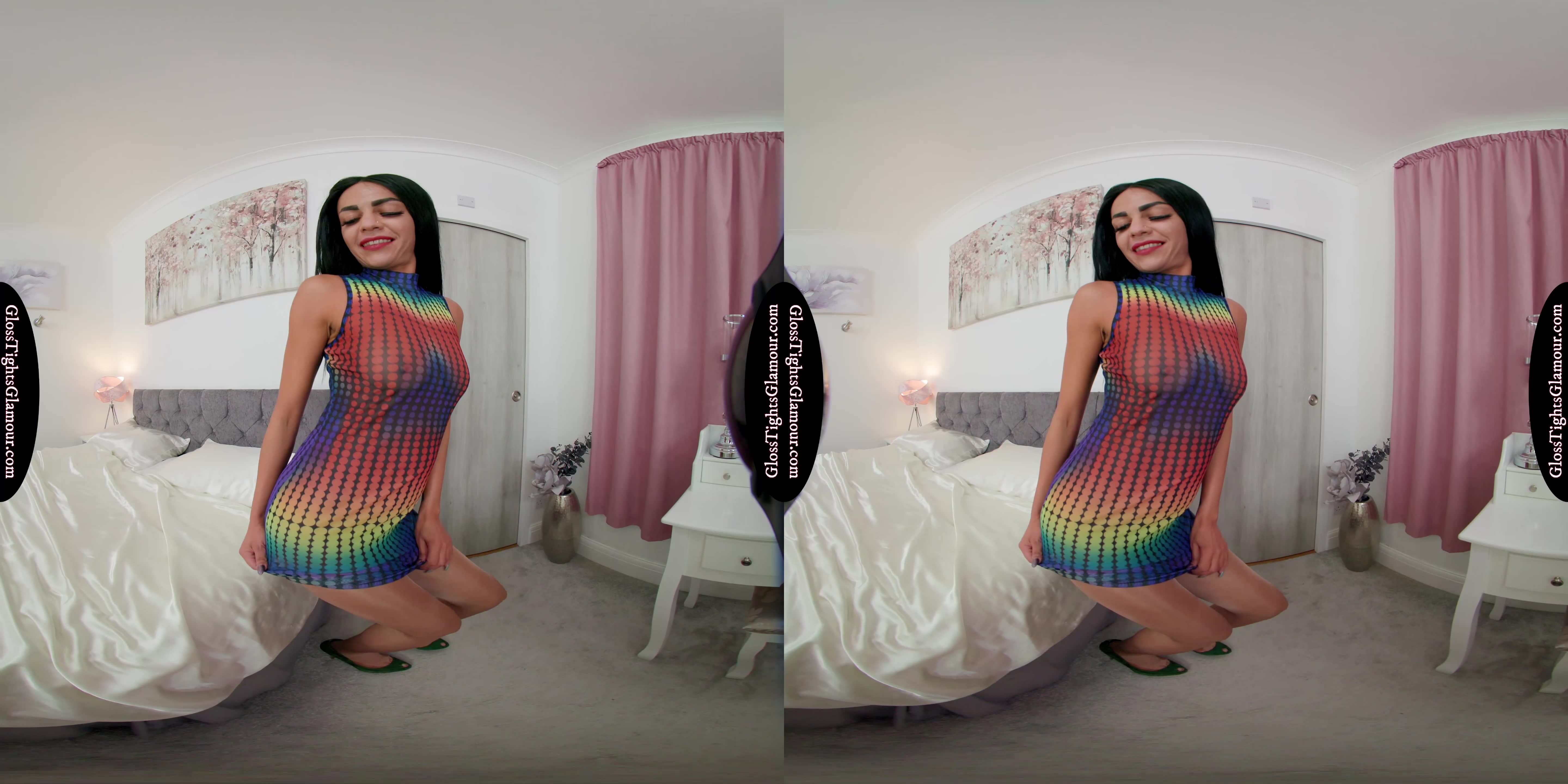 8K 60fps VR Video from shoot with Selena wearing a very stylish multi-coloured dress (sans bra), natural glossy tights/pantyhose with briefs/panties underneath, and high-heeled open/peep toe shoes that stay on throughout, in a sumptuous tease to topless.