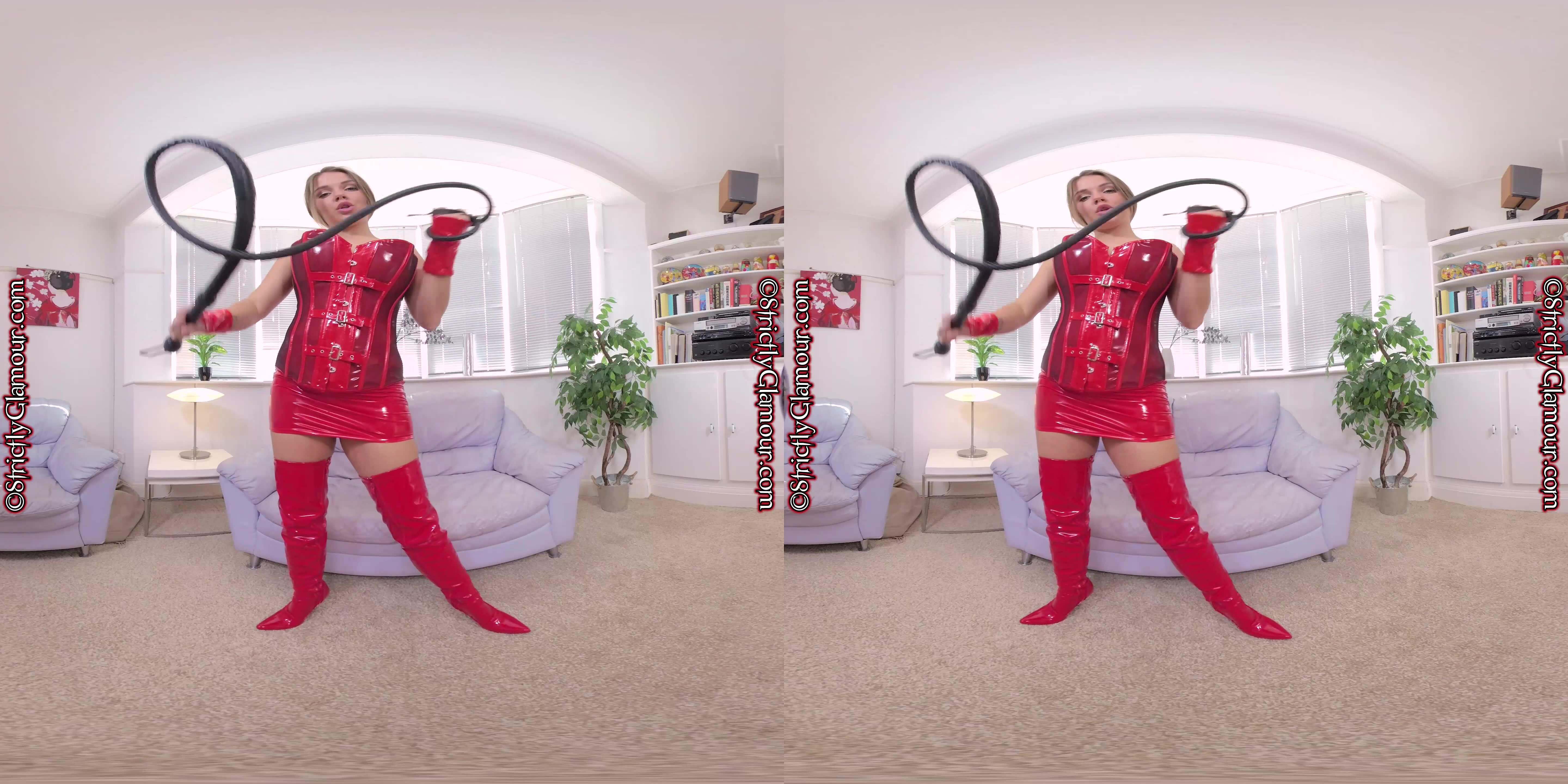 8K 60fps JOI VR Video featuring Mistress Ophelia who steps forward with leather bullwhip in hand wearing an outfit comprising; red long sleeved bodysuit with black zipper (sans bra & briefs/panties),...