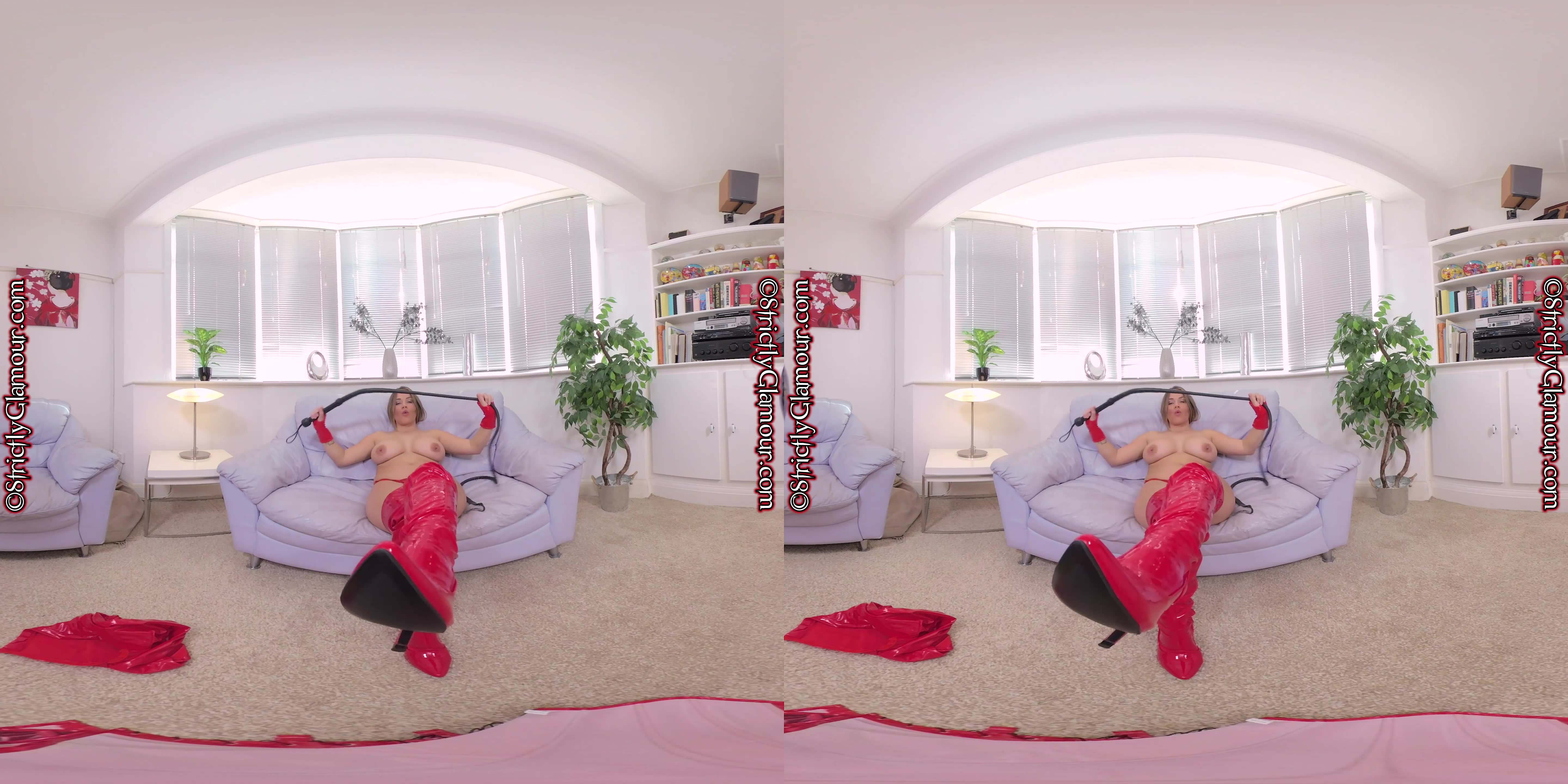 8K 60fps VR Video with femdom/findom mistress Monika Lara Smith (MLS) wearing a red pvc outfit comprising; body suit (sans bra & briefs/panties), mini/micro skirt, black holdup stockings with lace tops,...