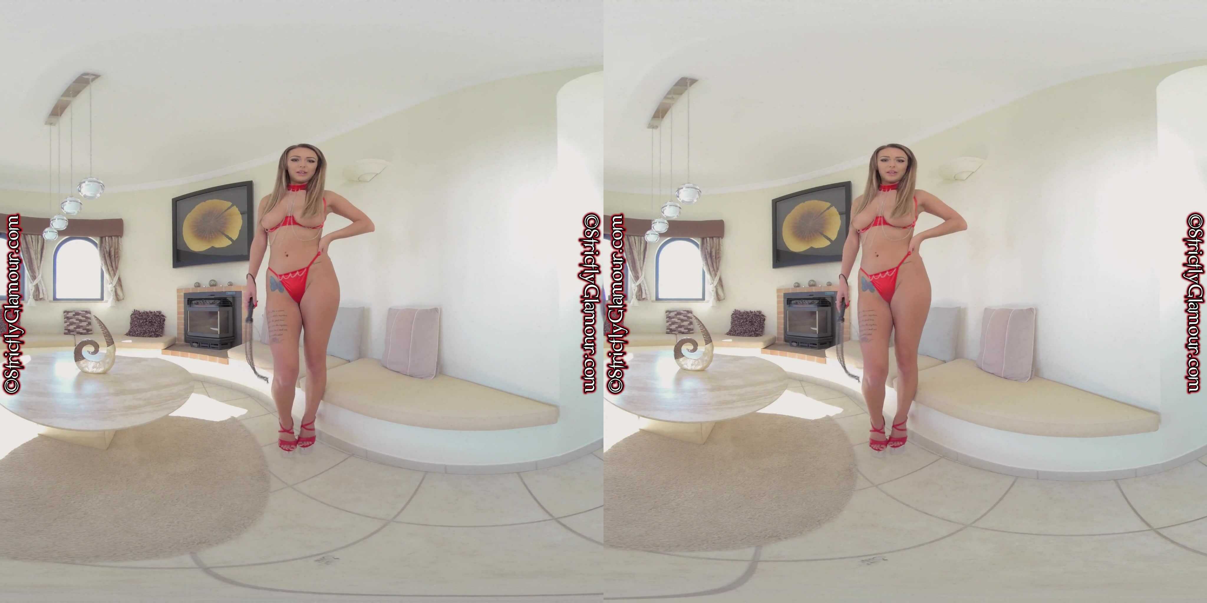 Jenny James stars in a captivating 8K VR tease, flaunting a red bra and black leggings. Experience her seductive taunts with a riding crop, immersing you in intense, thrilling moments of desire.