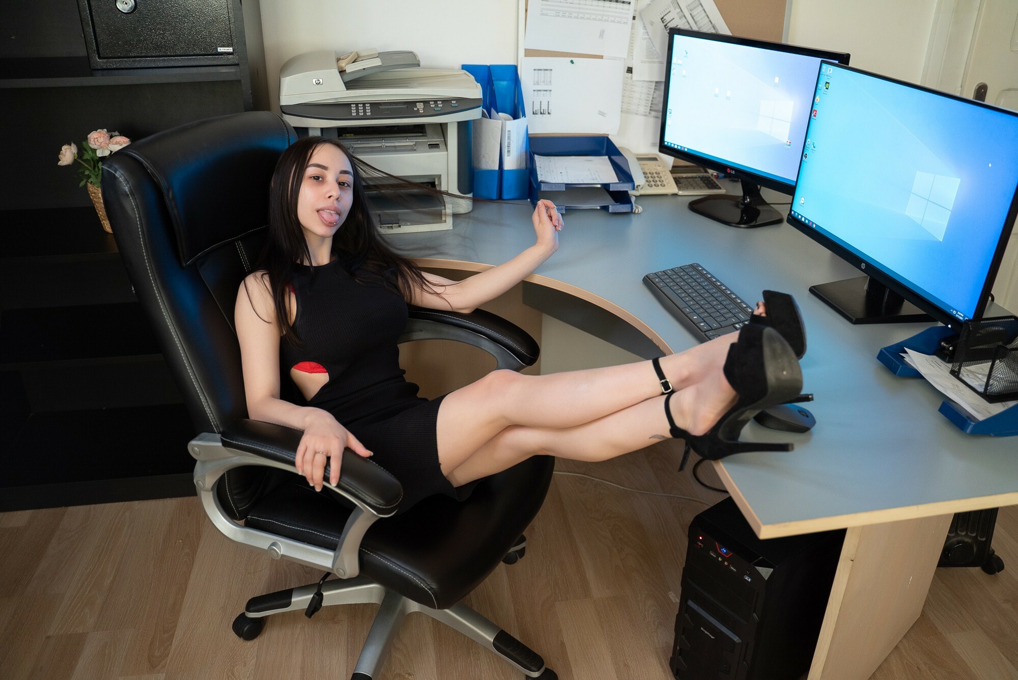 The tension builds quick when she leans over the desk in that tight outfit—damn, it’s a sight! The cowgirl moment? Absolute fire, with her taking control and the energy just skyrocketing. Then, flipping to reverse cowgirl, you feel every shift, every move, like you’re part of the action. And when it switches to doggystyle, the intensity ramps up even more, her reactions so real it’s almost too much to handle.