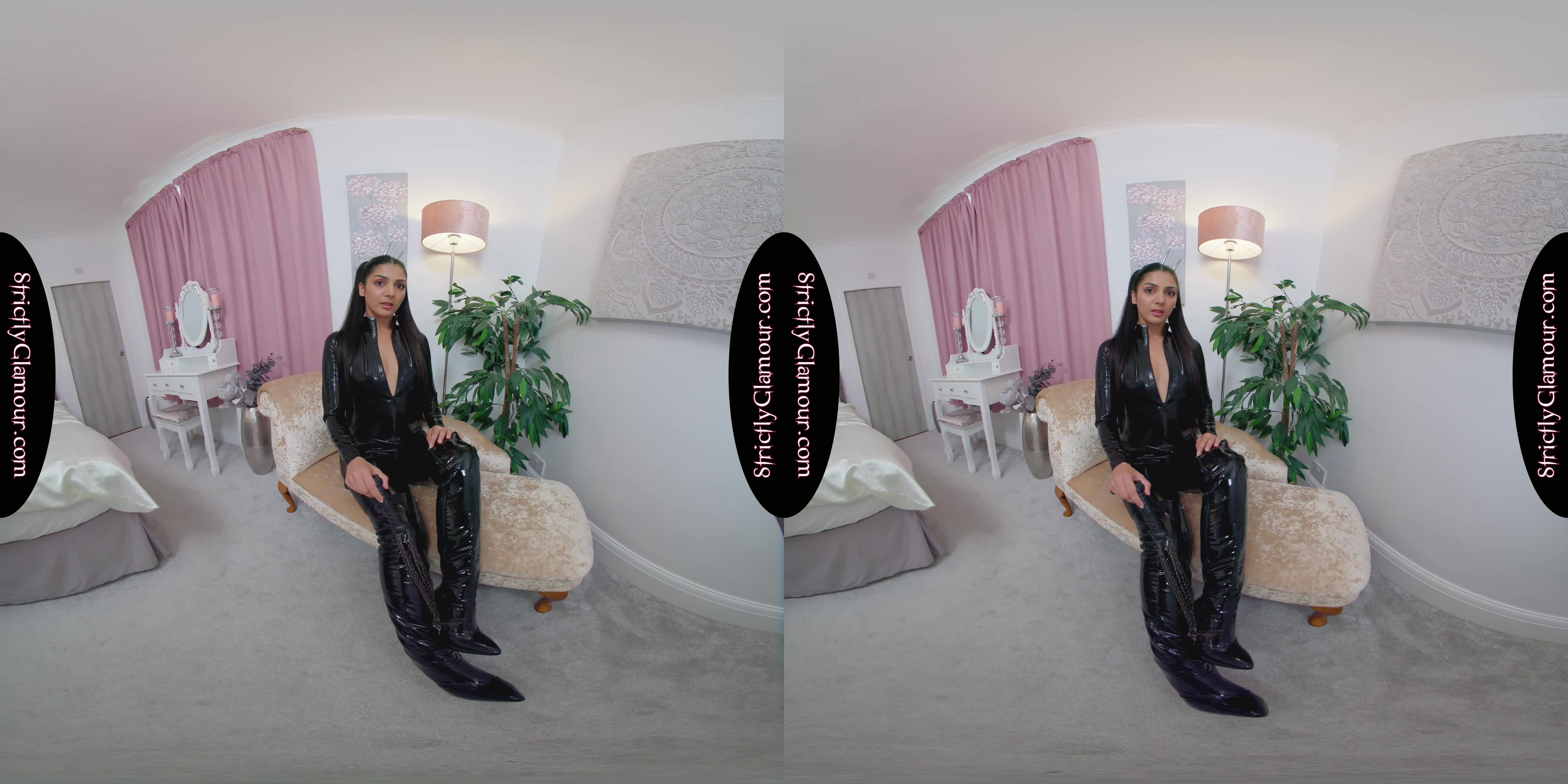 8K 60fps VR Video from shoot with Jasmine wearing a black latex catsuit (sans bra), black stiletto heeled OTK boots, steps forward with flogger whip in hand to entertain and tease in a powerful performance to topless. Listen carefully to what she has to say and enjoy!