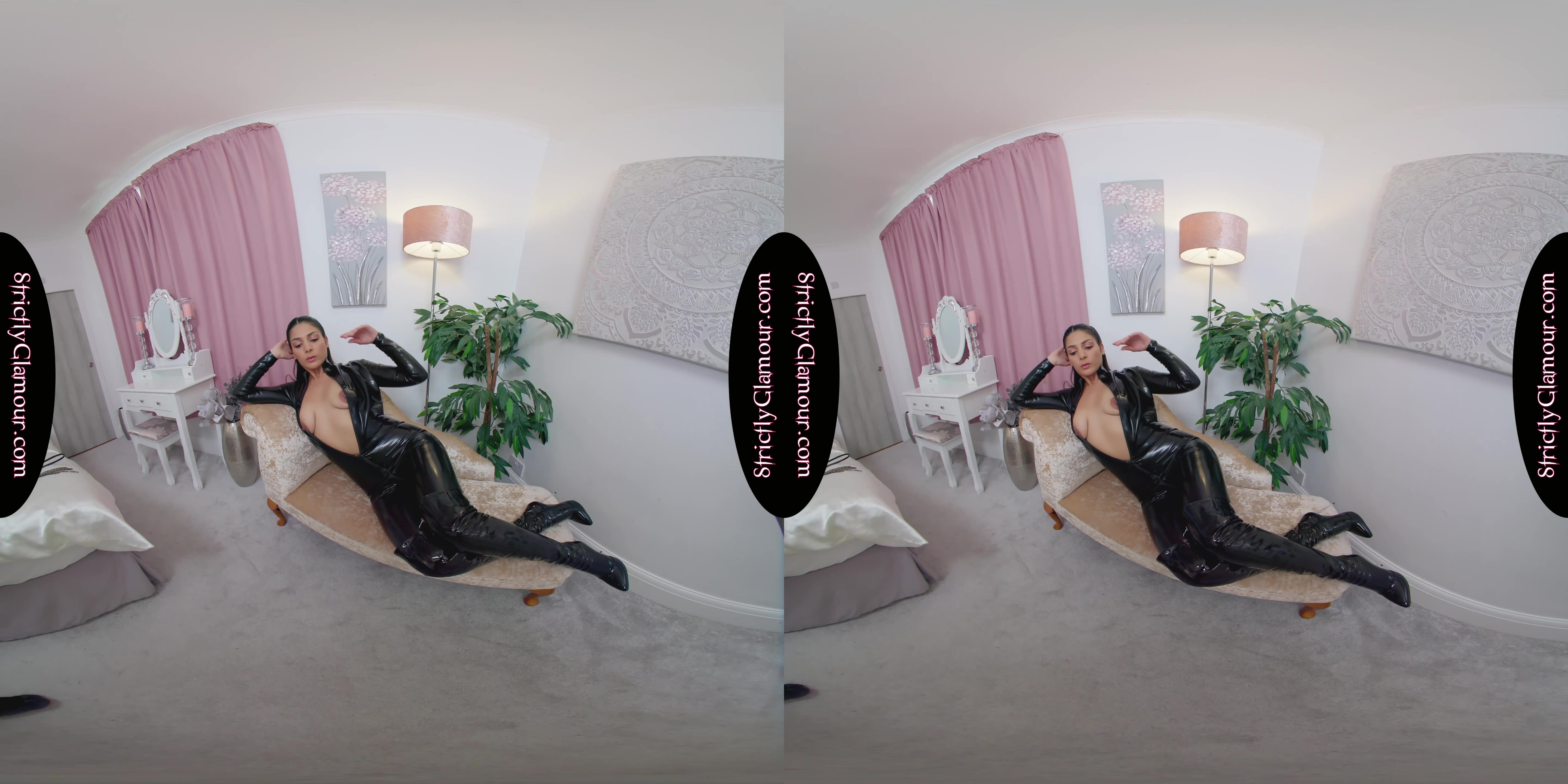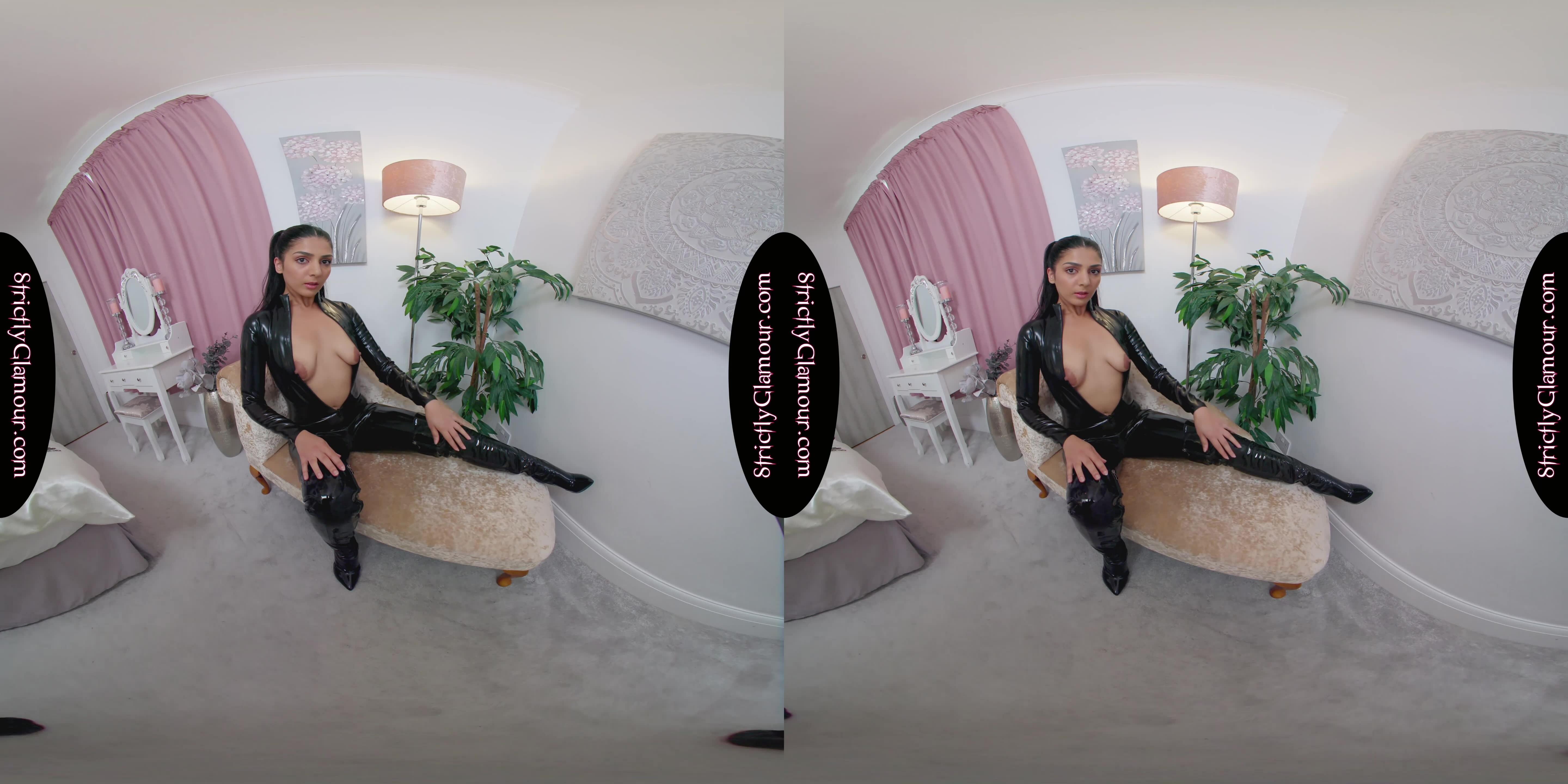 Discover Shelena's captivating black latex striptease in stunning 6K VR. Feel the tease as she touches her natural tits and trimmed pussy. Experience binaural sound and voyeur POV now.