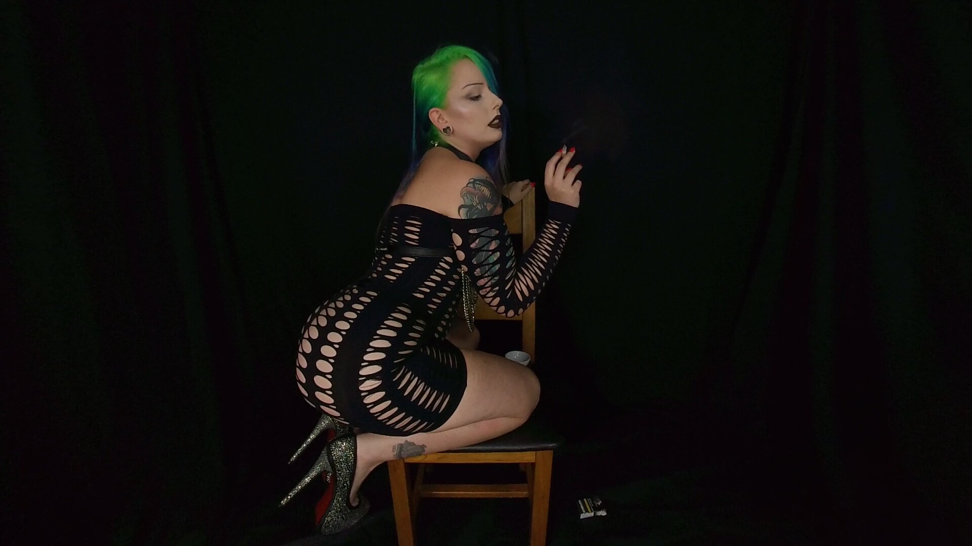 We catch the stunning Chloe Toy between scenes, having a cup of tea and enjoying her e-cigarette. Check out her amazing body in that very sheer fishnet bodssuit