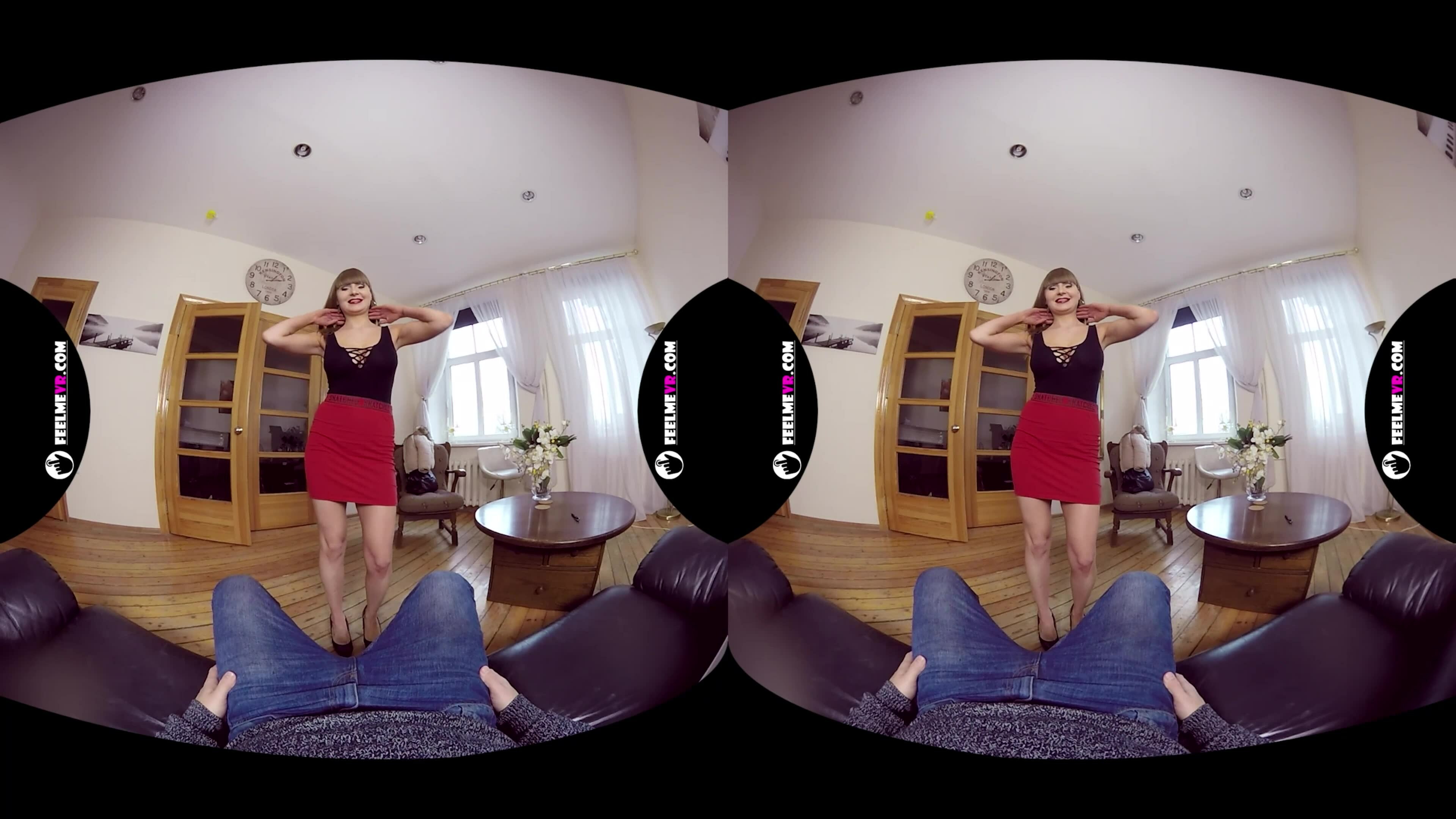 Experience Evelina like never before in stunning 180° VR - indulge in her sultry solo striptease, showcasing her petite frame and natural tits. Feel the intimacy as she teases you with high heels and a seductive smile.